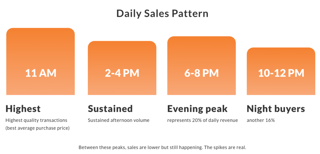 But here’s the real insight: 11 AM is the strongest buying hour on Wednesday, Thursday, Saturday, and Sunday too. Not as much volume as Tuesday, but the pattern is identical.