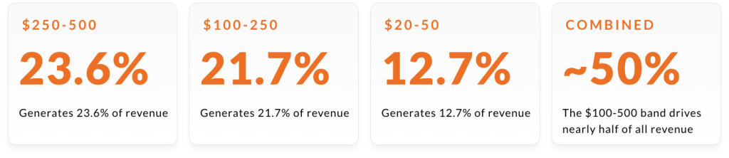 A customer who enters at $250-500 is worth 8.9x more lifetime value than someone who enters at $0-20.